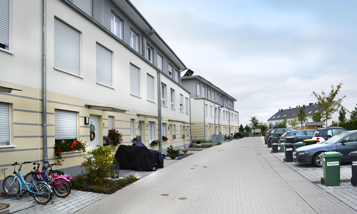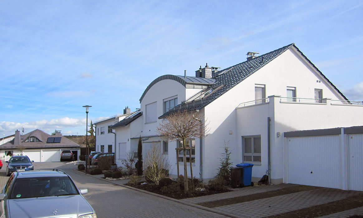In zentraler Lage entstand 2005 dieses Neubauprojekt. Die neutrale und warme Farbgebung des Doppelhauses und der angrenzenden Reihenhäuser geben der Wohnanlage einen ländlichen Landhausstilcharakter.