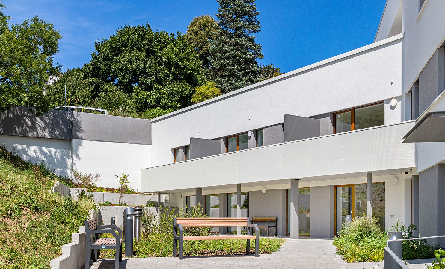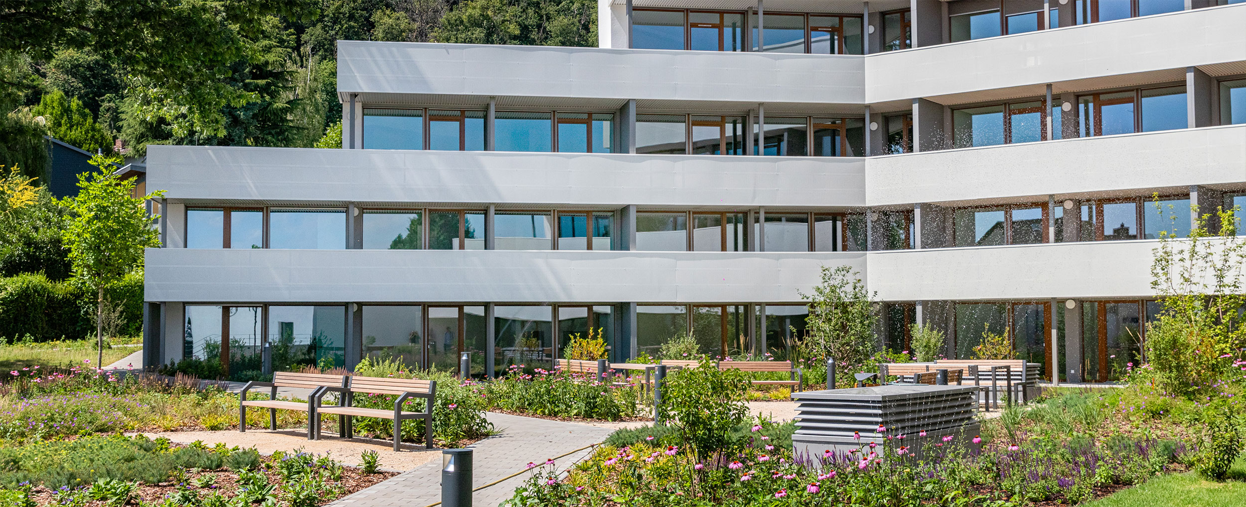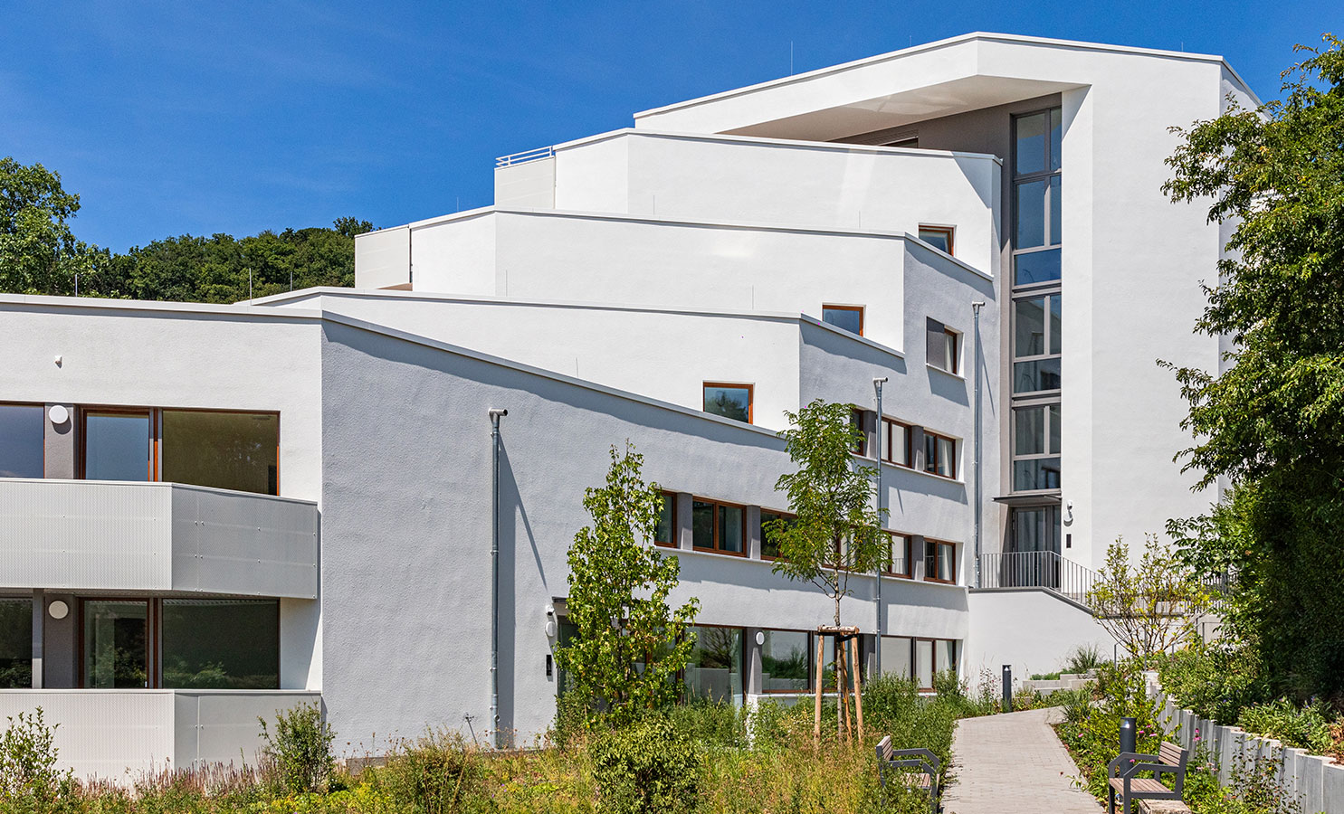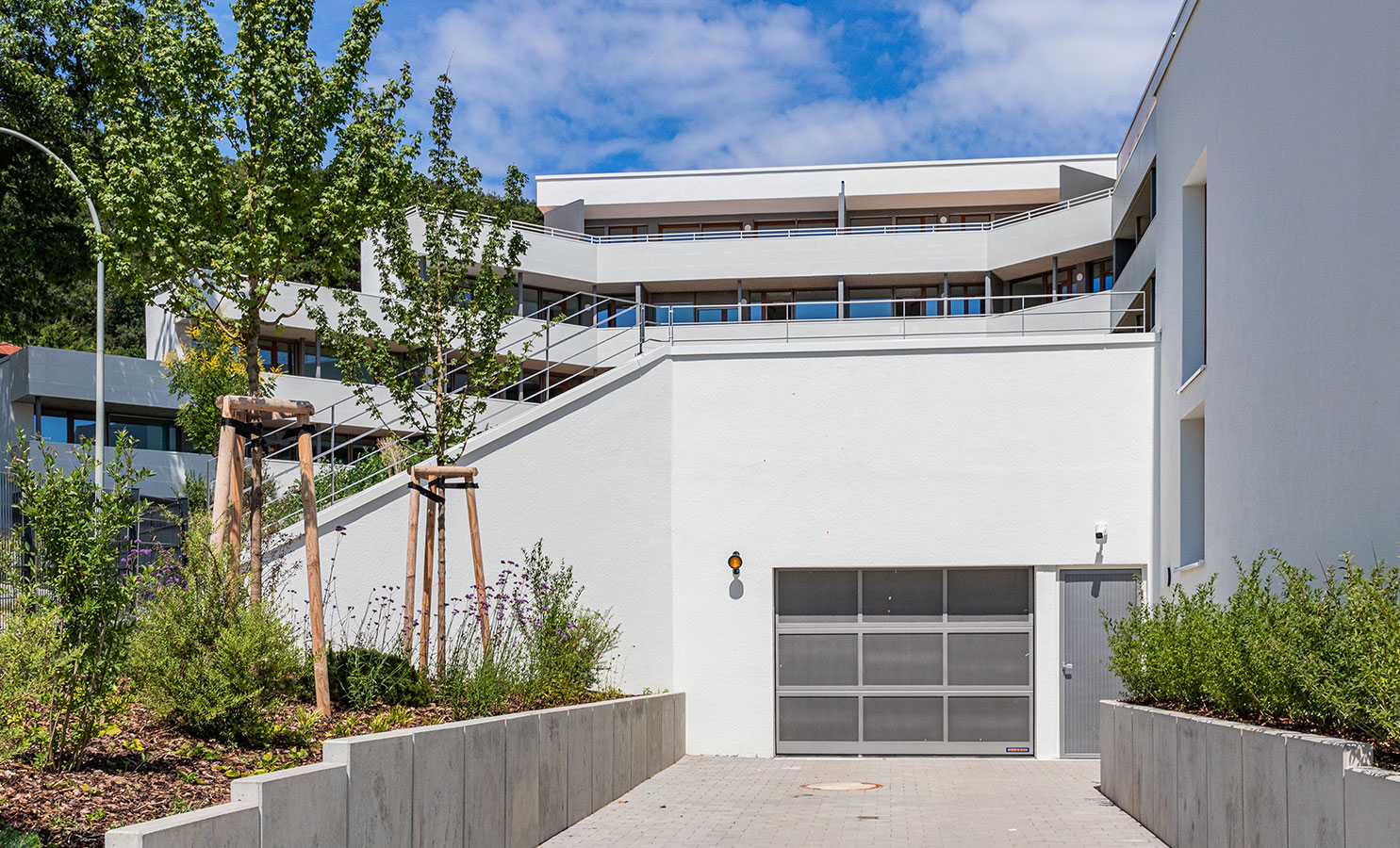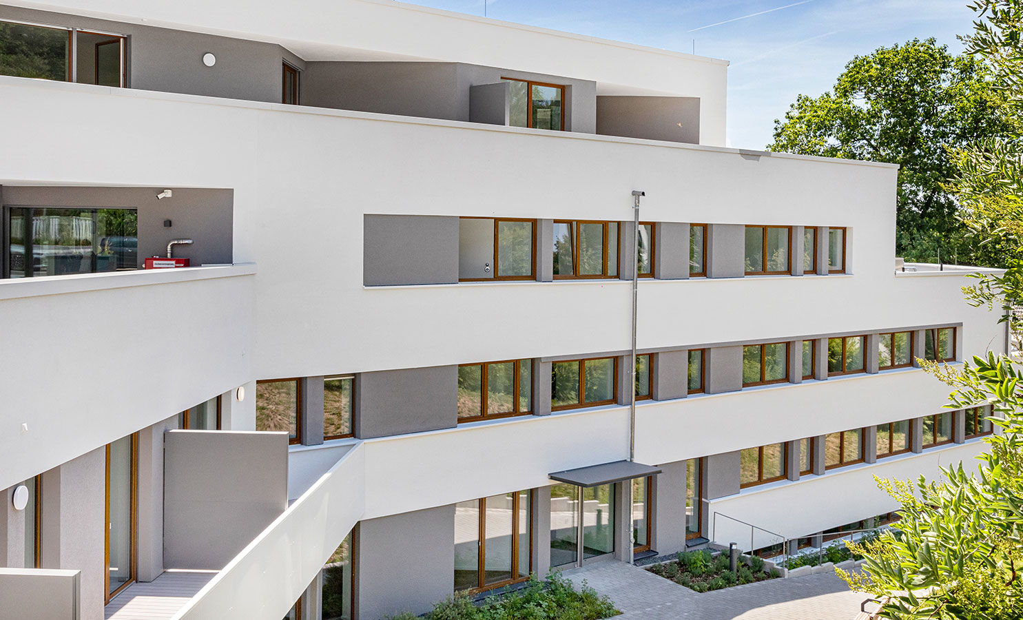 Der Haupteingang befindet sich in der 5. Geschossebene. Selbstverständlich sind alle Ebenen problemlos und barrierefrei erreichbar und über zwei