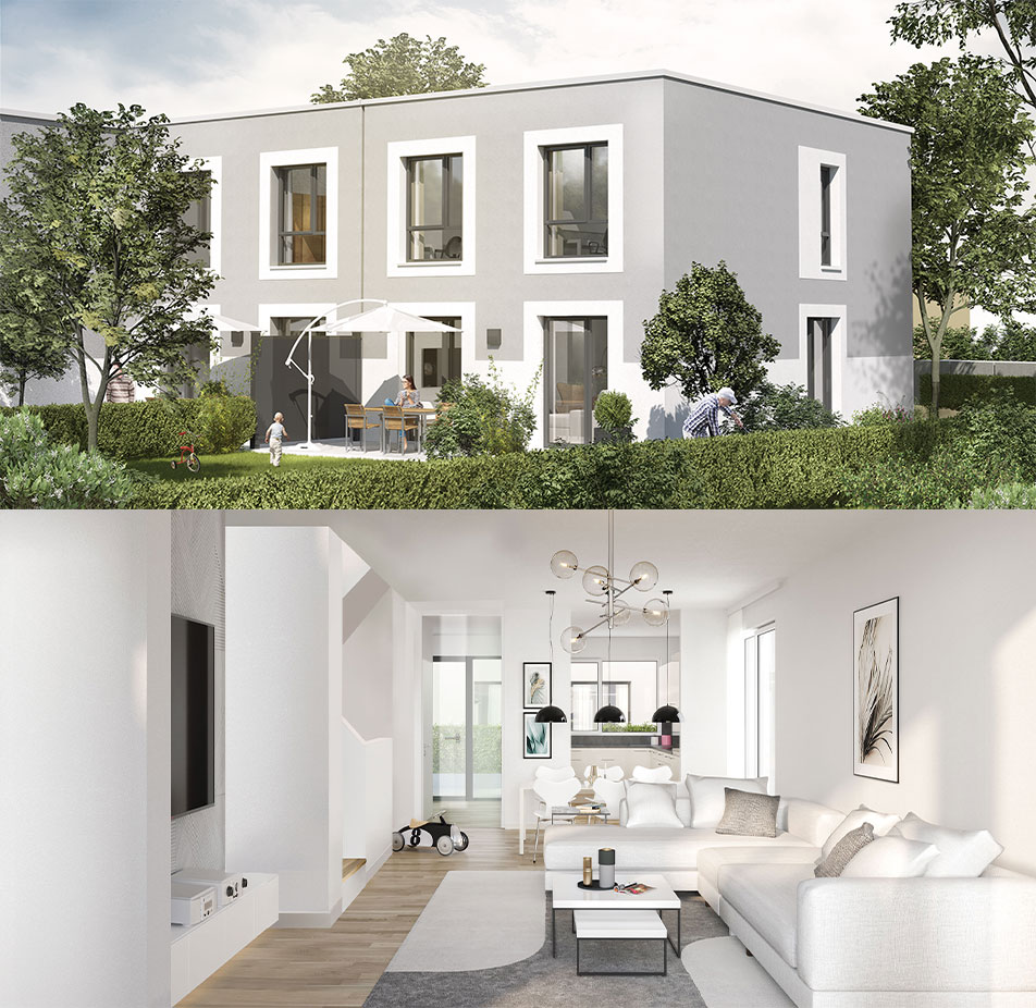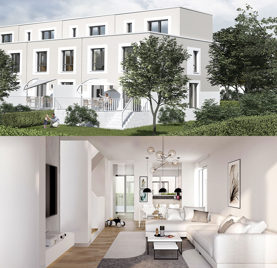 und zwei zusätzlichen Zimmern ausgestattet. Die Gesamtwohnfläche des Reihenhauses beläuft sich je